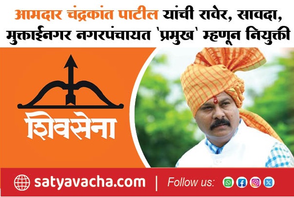जळगाव (प्रतिनिधी) : राज्यभरात सर्व राजकीय पक्ष जोमात कामाला लागलेले असून जळगाव जिल्ह्याच्या नगरपरिषद व नगरपंचायत निवडणूक २०२५ च्या पार्श्वभूमीवर शिवसेना पक्षाचे प्रमुखांची नियुक्ती अधिकृतरित्या जाहीर केली आहे. आमदार चंद्रकांत पाटील यांची रावेर, सावदा आणि मुक्ताईनगर नगरपंचायत ‘प्रमुख’ म्हणून नियुक्ती करण्यात आली आहे.
