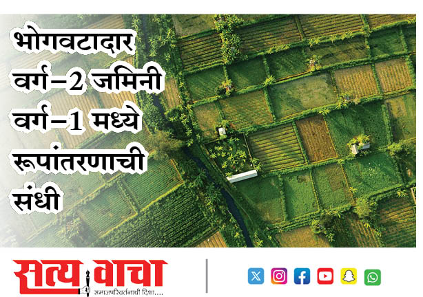 जळगाव (प्रतिनिधी): महाराष्ट्र शासनाच्या महसूल व वन विभागाच्या ४ मार्च २०२५ रोजीच्या अधिसूचनेनुसार “महाराष्ट्र जमीन महसूल (भोगवटादार वर्ग २ व भाडेपट्ट्याने धारण केलेल्या जमिनी भोगवटादार वर्ग १ मध्ये रूपांतर) नियम, २०२५” अंमलात आले आहेत.