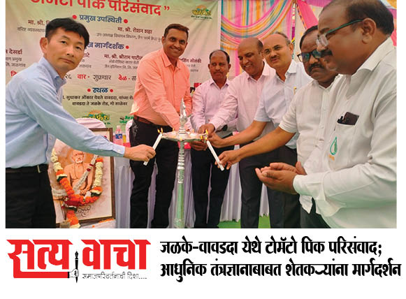 जळगाव (प्रतिनिधी): जैन फार्म फ्रेश फूड्स लि. (जैन इरिगेशन सिस्टीम्स लि. ची उपकंपनी) आणि कागोमे इंडिया प्रा. लि. यांच्या संयुक्त विद्यमाने जळके-वावडदा येथे ‘टोमॅटो पिक परिसंवाद’ उत्साहात पार पडला. वावडदा-जळके रोडवरील प्रगतशील शेतकरी सुधाकर ओंकार येवले यांच्या शेतात झालेल्या या कार्यक्रमास शेतकऱ्यांनी मोठ्या संख्येने उपस्थिती दर्शवून उत्स्फूर्त प्रतिसाद दिला.